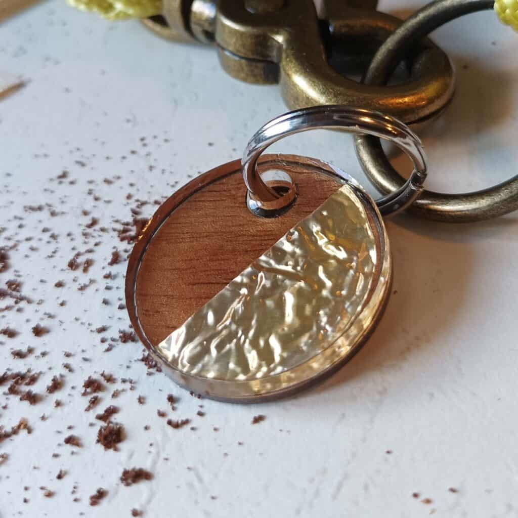 Le bois gravé, issu de récupération, est de belle essence (noyer, chêne, acacia…). Il est travaillé tout en finesse pour une médaille légère. L’élément brillant et doré, est également issu de matériaux de récupération et découpé à la main.