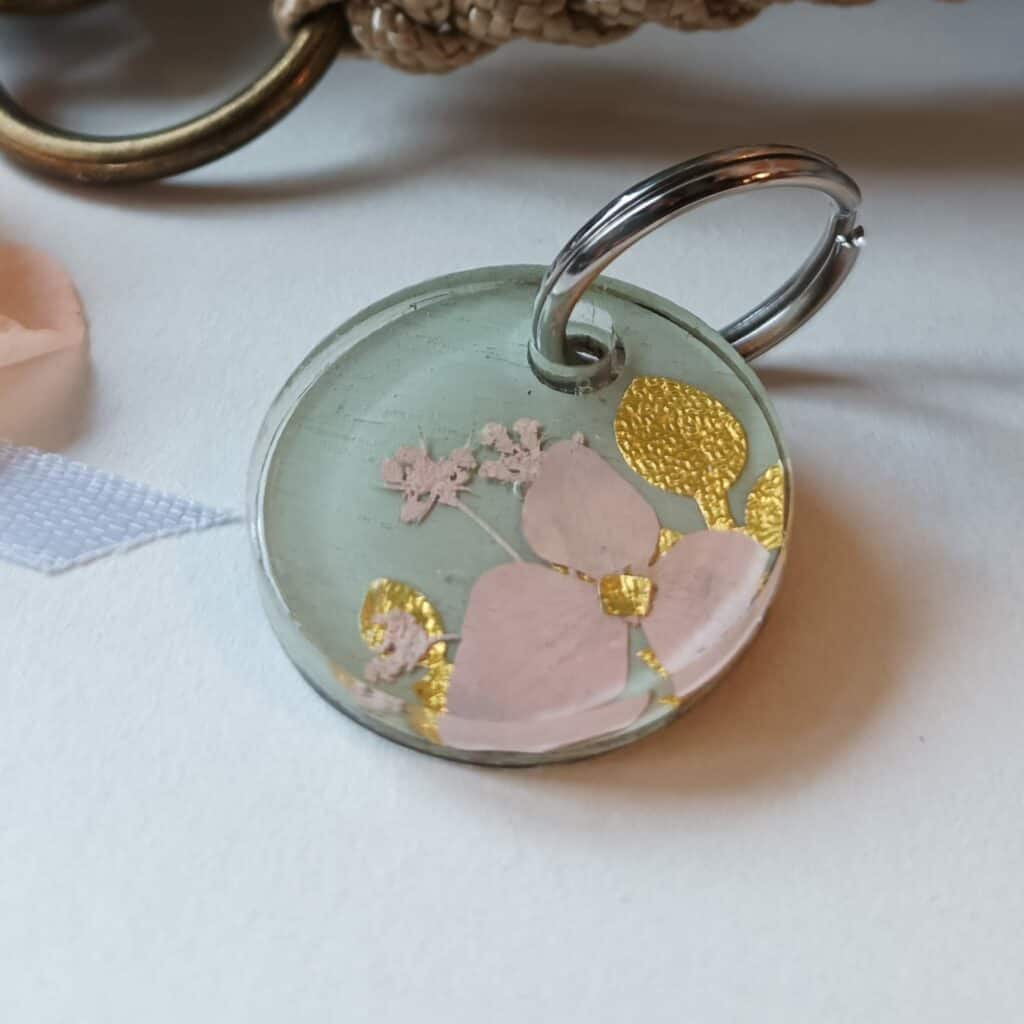 Cette médaille d’identification est délicatement décorée de fleurs séchées. Hortensia et dentelle de la Reine Anne sont peintes à la main, avec une peinture biosourcée, dans des teintes douces pastels.
